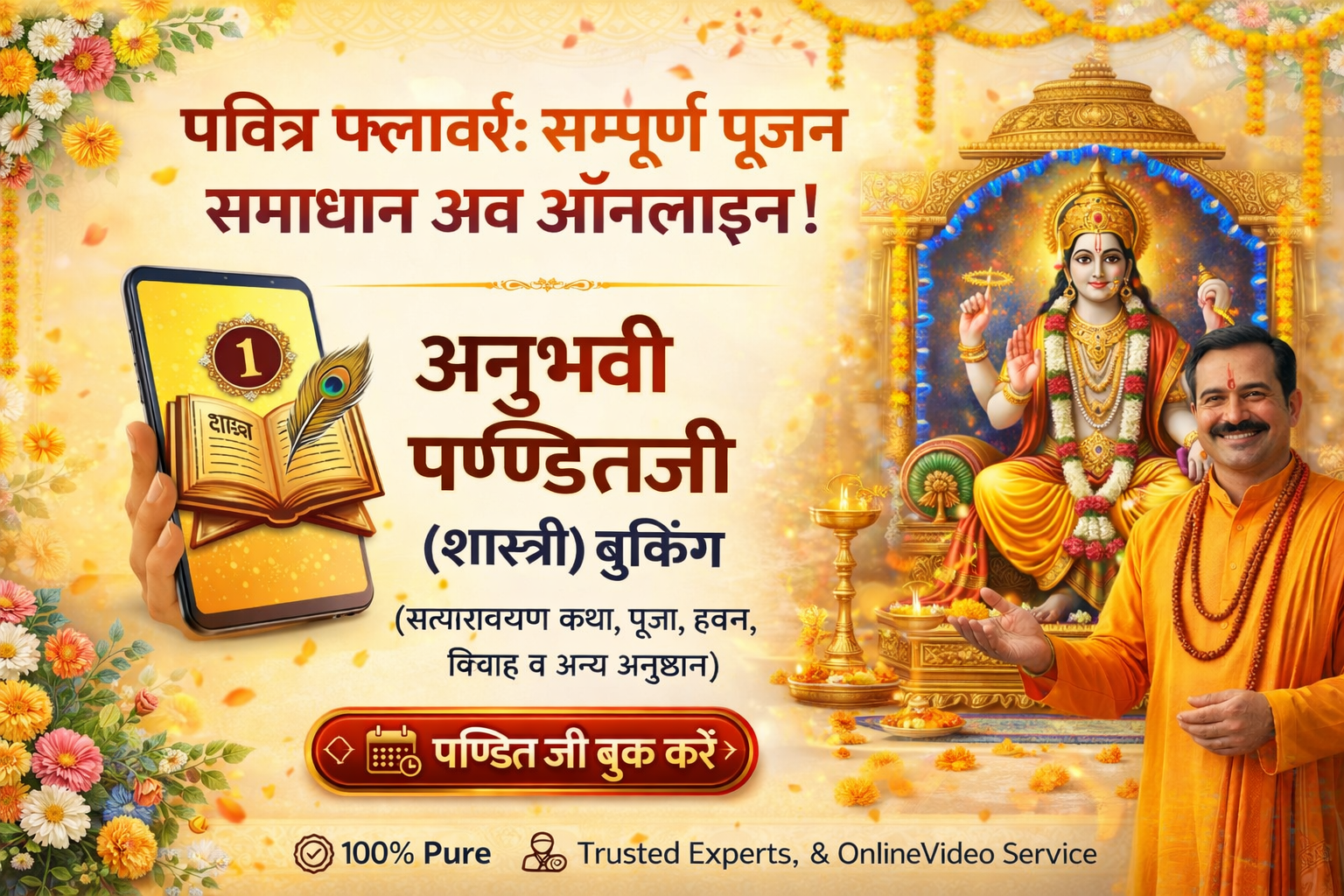 पवित्र फ्लावर्स एक भरोसेमंद प्लेटफॉर्म है जहाँ आप सत्यनारायण कथा, पूजा, हवन, शादी विवाह आदि के लिए अनुभवी पंडित जी बुक कर सकते हैं